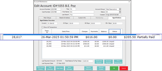 This results in the charge being set to 'Partially Paid' with a balance remaining of $205.50 as seen below