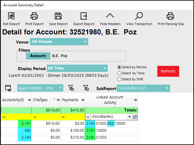 The Linked Account Activity field will list the ID's that are linked, along with the balances being utilized. In the example above you can see there are two payments linked to the one charge, which totals to $410.50.