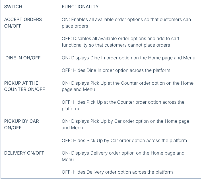 In addition, there are 5 switches available to control platform wide order options as described below.