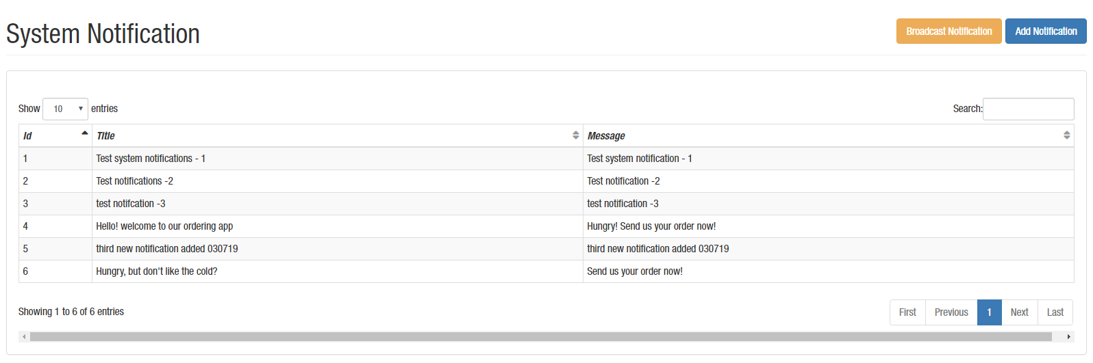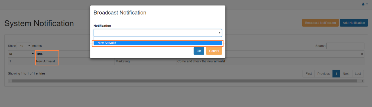 Once the notification is created you are able to send it. At the system notification screen by clicking on “Broadcast Notification” users can send a broadcast notification, the user will be required to select a notification from the dropdown (which was previously created, as explained on the section above), and click  “OK” button. The notification will be sent to all the customers that have the app installed.