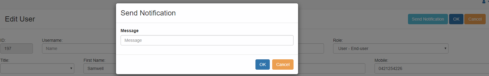 Notifications can also be sent individually. To do so, at the user’s page, click on the desired user. This will open the edit user’s screen. On the right side, click on the “Send Notification” button. Pop-up screen will open, where you can type the desired message and click “OK” button to send.