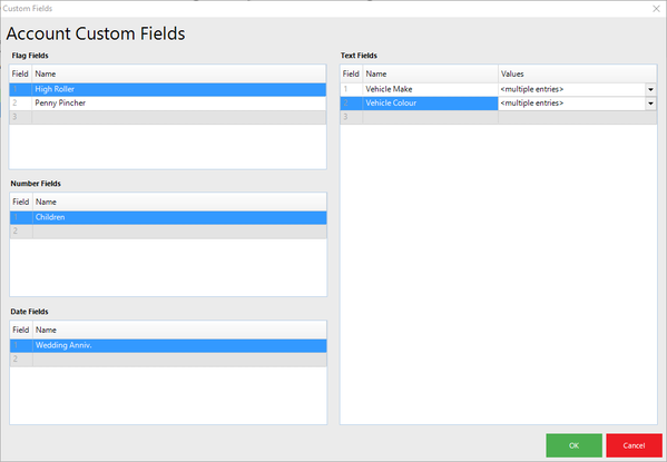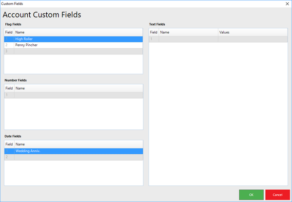 - Below are examples of the Custom Fields window with a few of the example fields entered and the Account Maintenance Custom Info Tab with those examples displayed