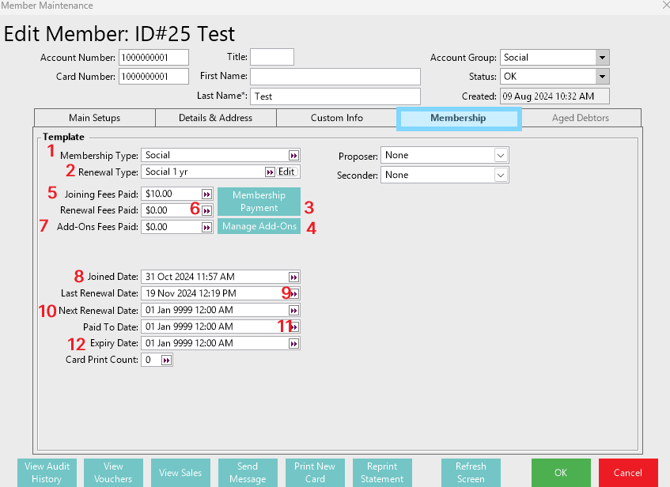- In order for this Tab to be active on the Accounts, the Membership Module must be authorised and the Membership Group set in the Venue Maintenance