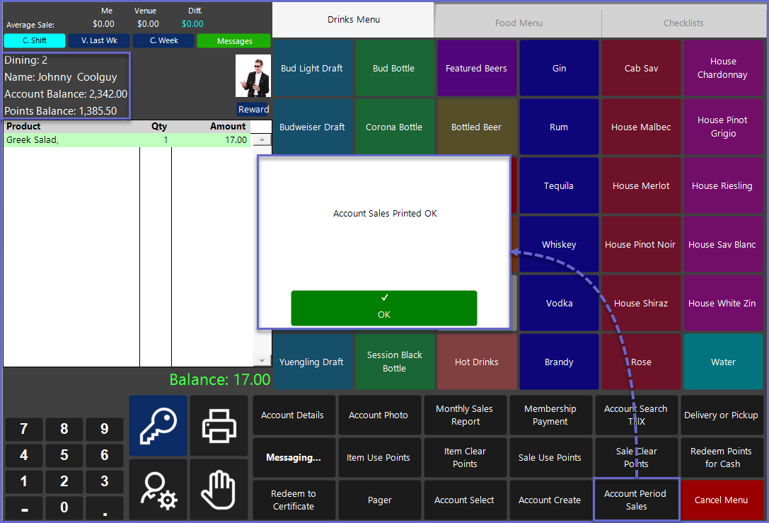 - When an Account is opened in SmartPOS, after selecting the "Account Print Period Sales" Sub-Function is selected, a Report will then be printed to the designated Printer.