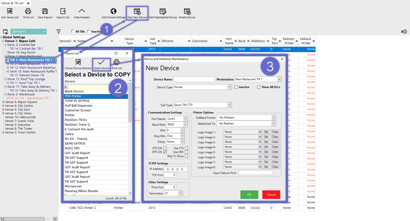 - To add a new Device, first, ensure that the desired Till is highlighted in the tree-list and then either right-click and select Add Device under or simply select the Add New Device button from the top of the tab
