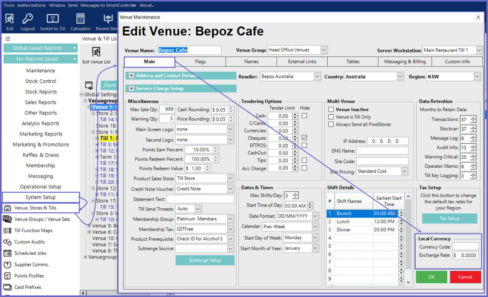 - Go to the System Setup tab from the side menu and select 'Venue, Stores & Till'