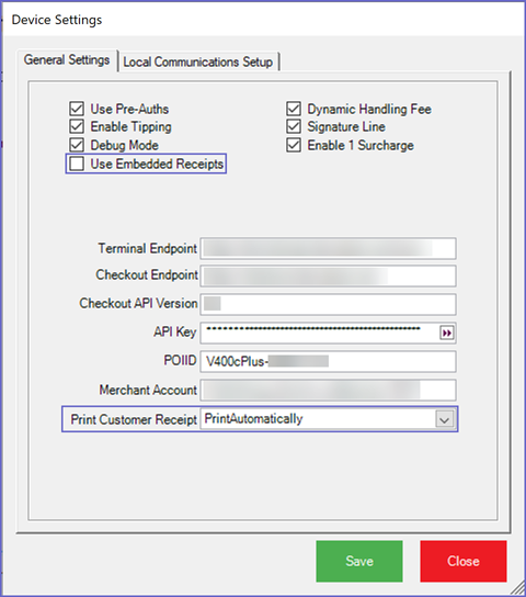 - The 'Use Embedded Receipts' setting is a flag present within the Device Settings for an Adyen EFTPOS Device