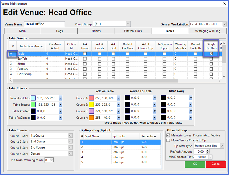 - While on the Tables Tab in Venue Maintenance, ensure that the Single Use only flag is enabled for the Table Group that will be used with the BladePay device