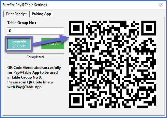 - After the Table Group Number has been entered, click on the Generate QR Code button to generate a QR Code to scan using the Pay at Table App