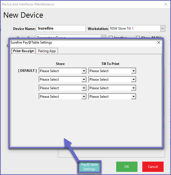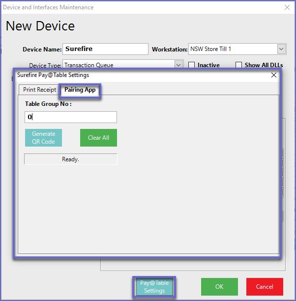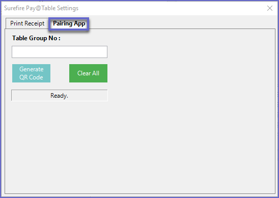 - The Surefire Pay @ Table Settings window will open; select the Pairing App tab