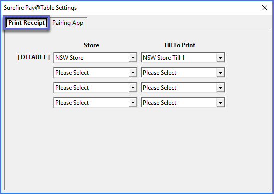 - Within the Print Receipt tab, four Stores & Tills can be selected which will be able to Print receipts from a remote printer after processing a payment with the Pay At Table App