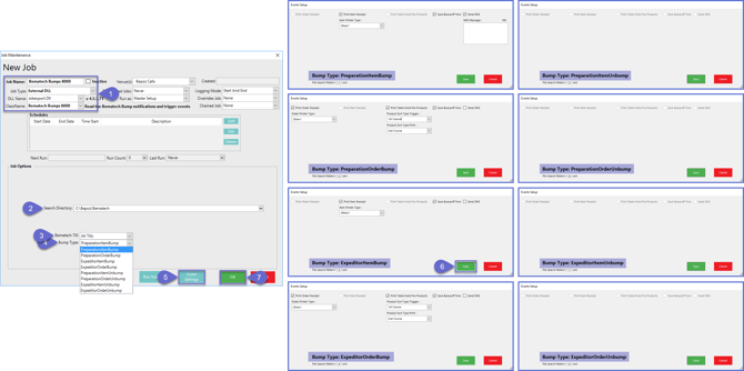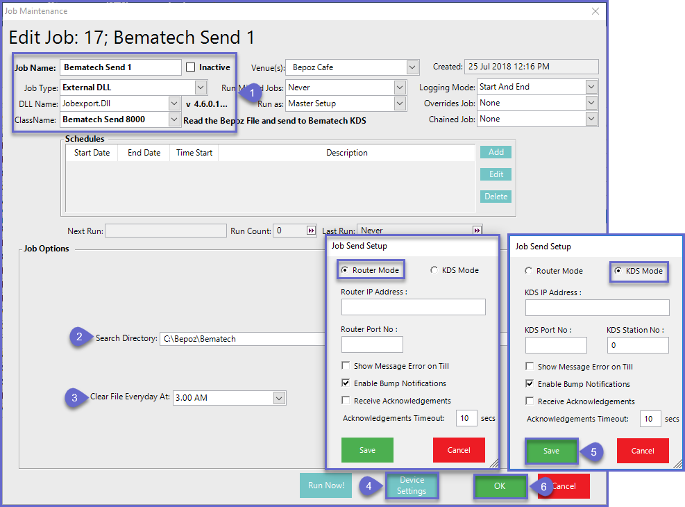 - To reiterate from above: The Bematech Send 8000 Job must be set up in a one-to-one relationship with the Devices meaning that for every KDS Device set up in BackOffice, a Job is needed to send the XML to the Device; so for every KDS Device set up, a corresponding Bematech Send 8000 Job will also need to be created