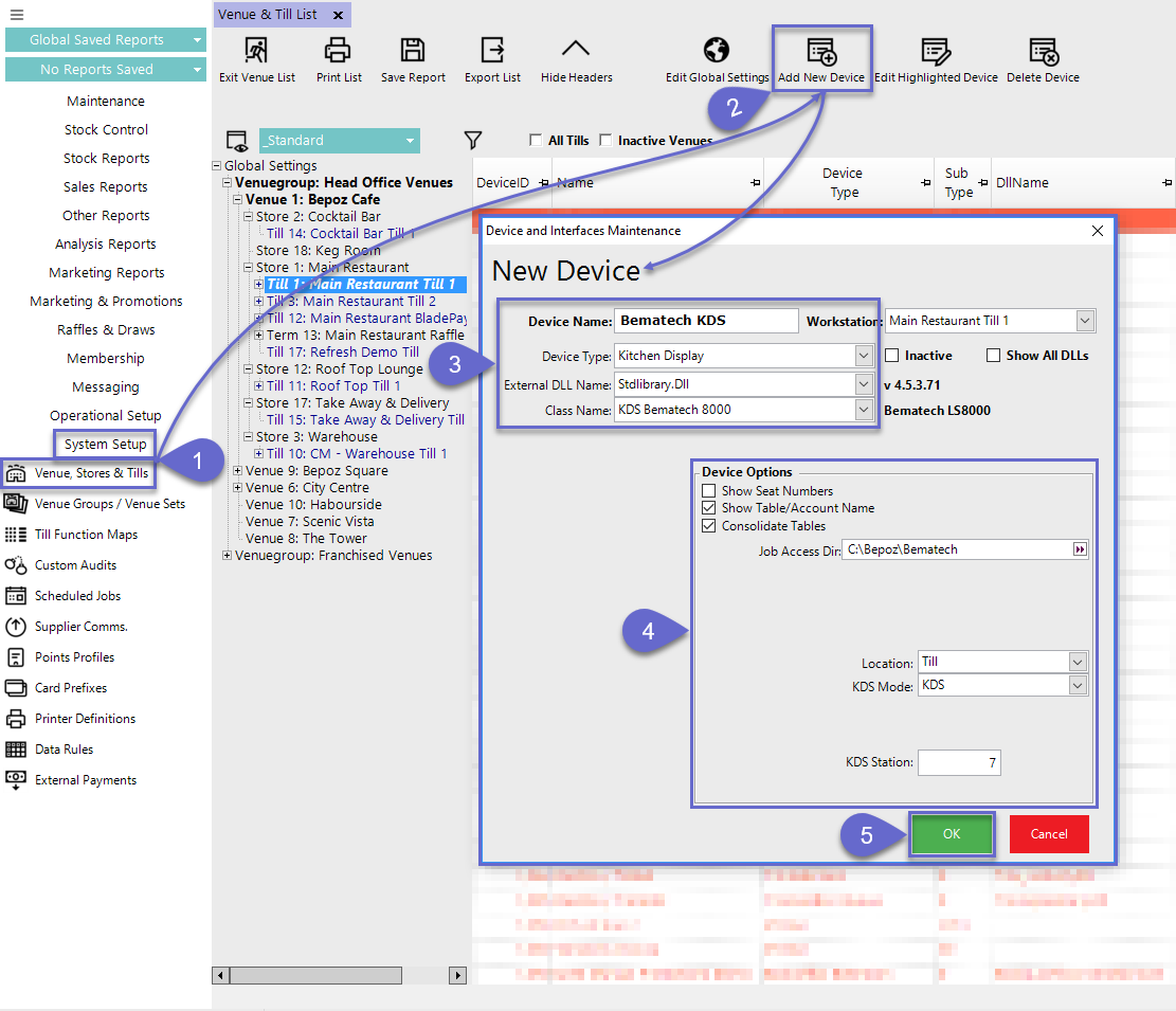 - Enter a relevant Device Name, set the Device Type to 'Kitchen Display', the External DLL Name to 'Stdlibrary.Dll', and the Class Name to 'KDS Bematech 8000'