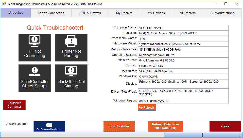 The Bepoz Diagnostics Dashboard is the main menu for troubleshooting issues. There are a variety of options that Operators can select from including: Server Connection Checking, Hardware Specs, Software Errors and Troubleshooting, Database Management and Access.