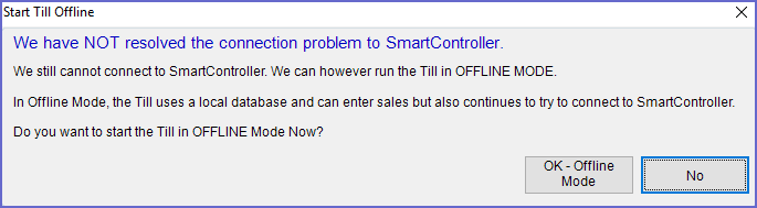 Organizations can control which SmartPOS Workstations are permitted to enter Offline Mode in the System Setup so that Offline mode cannot be accessed through every Till.