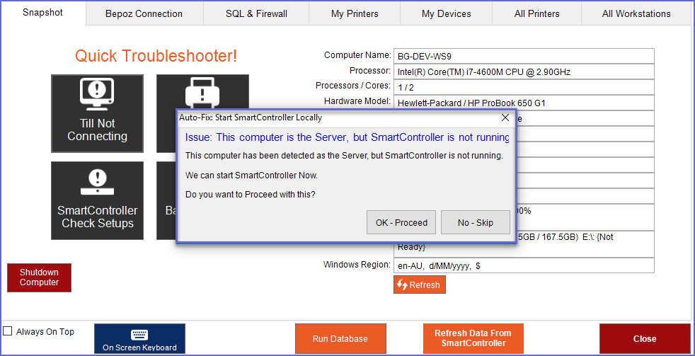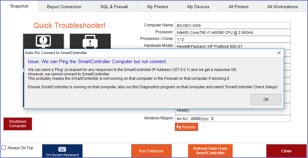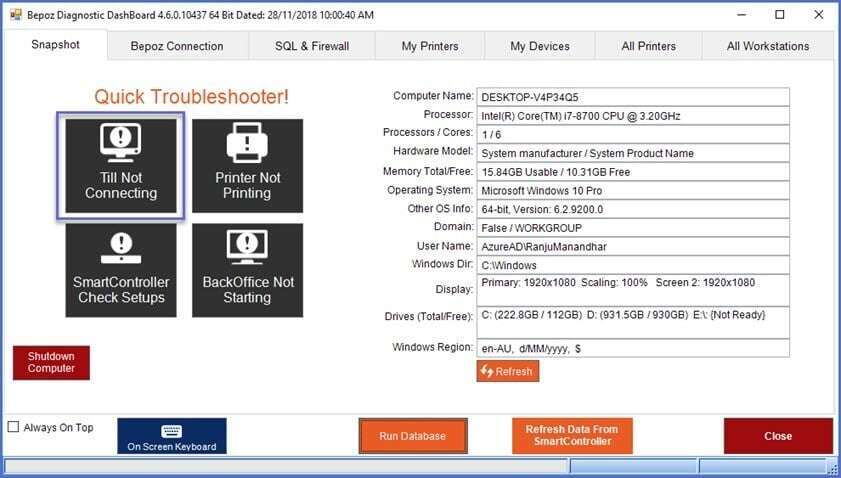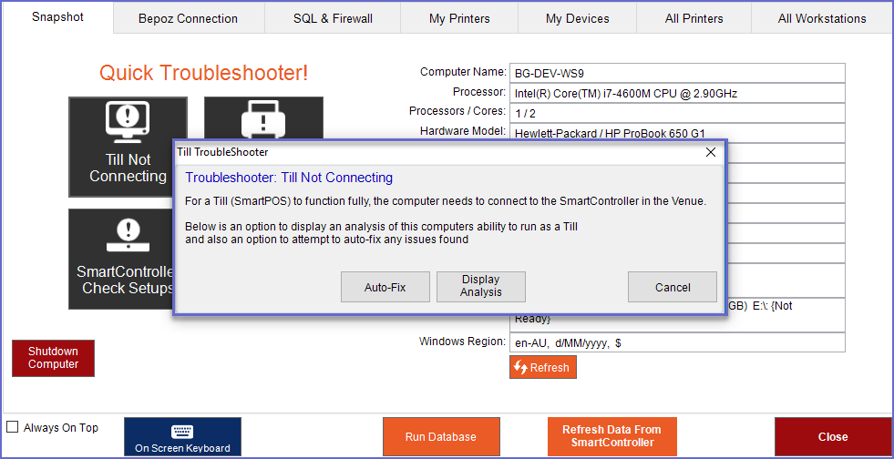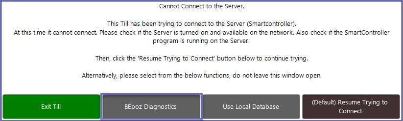 - As an alternative to entering Offline Mode, an Operator can choose to enter Bepoz Diagnostics to attempt to reconnect the SmartPOS Workstation to SmartController