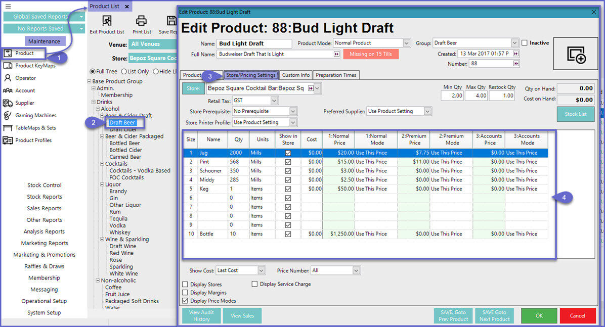 - In the Product Maintenance Tab, go to Store/ Price Settings and set the Size and Price of the product