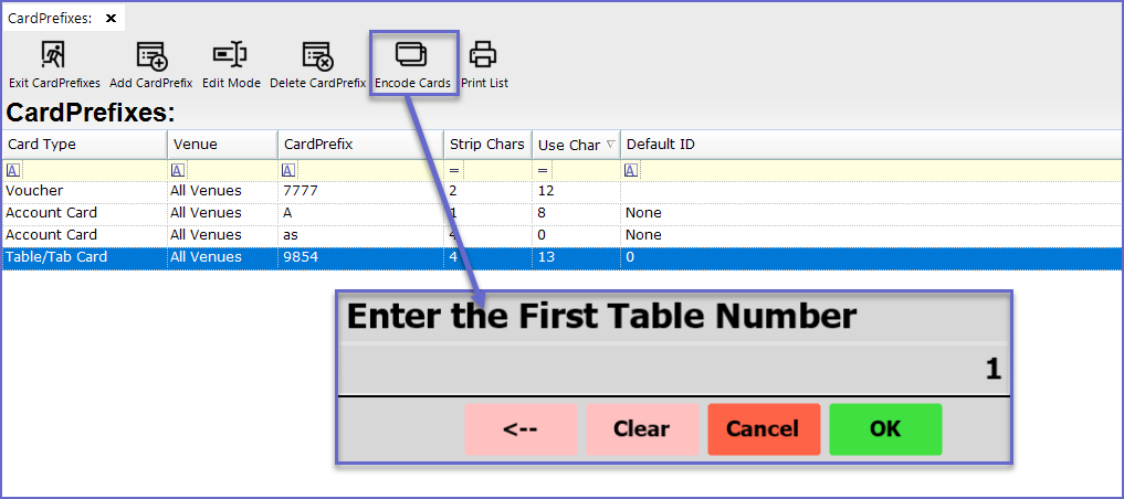 - To Encode Cards, highlight the line and press on the 'Encode Cards' button at the header which will display a prompt asking operator to Enter the First Table Number