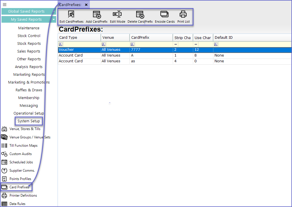 - To access Card Prefixes, navigate to the System Setup component in the side menu of BackOffice and select Card Prefixes which will open a Card Prefixes window