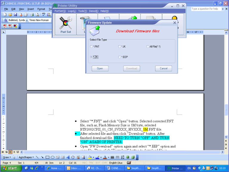 This article covers the Setup Guide for Chinese Printing on Gravity Printers. BTP-2002 CPII (1M or 2M bytes) Do SELF TEST of printer to find out what is "Flash Memory Size": 1M or 2M bytes Use Printer Utility v1.25 program and Press "Port Set" option Select correct Port Type and setting Press the "FW Download" option Select "*.FNT" and Press "Open" button.