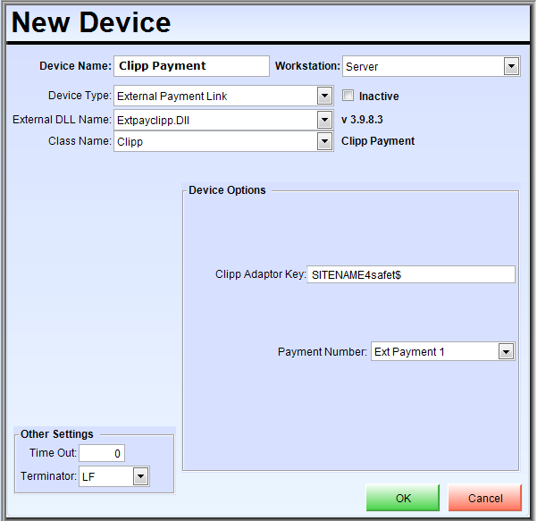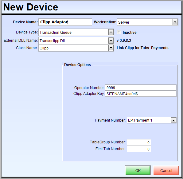 - Add a device on the server and EVERY till named ‘Clipp Payment’, Device Type ‘External Payment Link’, External DLL Name ‘Extpayclipp.Dll’ and Class Name ‘Clipp’
