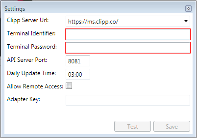 - The actual site settings will have a different Clipp Server URL called {+}https://ms.clipp.co/+[ |https://ms.clipp.co/]also a unique Terminal Identifier, unique Terminal Password, and a unique adapter Key