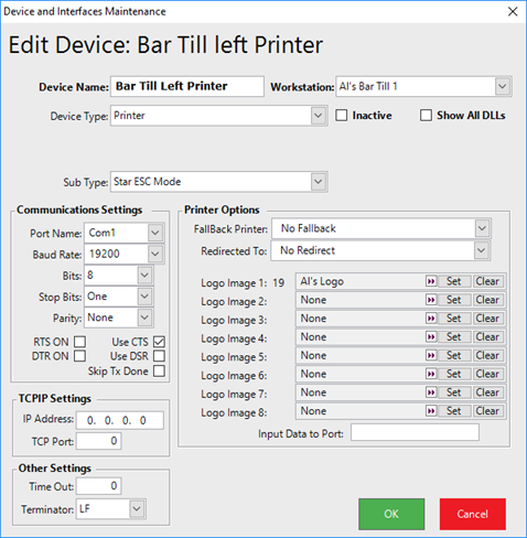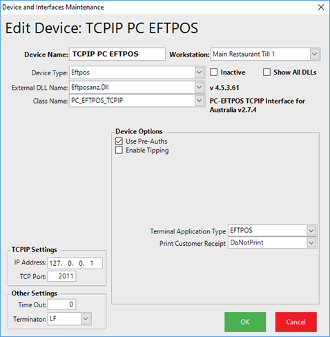 - Depending on the External DLL Name, the Class Name and the Sub Type being used, the EFTPOS Device may or may not need Communication Settings, TCPIP Settings, and/or Other Settings configured