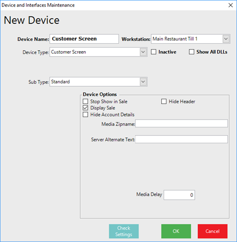 - As the only Sub Type available for a Customer Screen is Standard, the following Device Options apply and should be configured as needed: