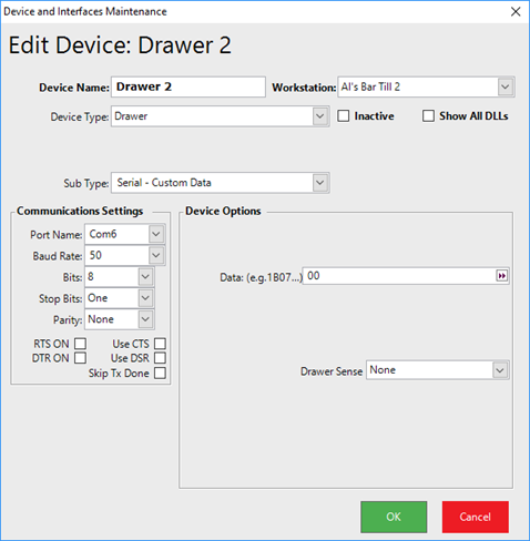 - If Communication Settings are required ensure that all are configured as required for the occurrence at hand; i.e., the Port Name will not always be the same as it will need to be set to the Communication Port that the physical Drawer is using