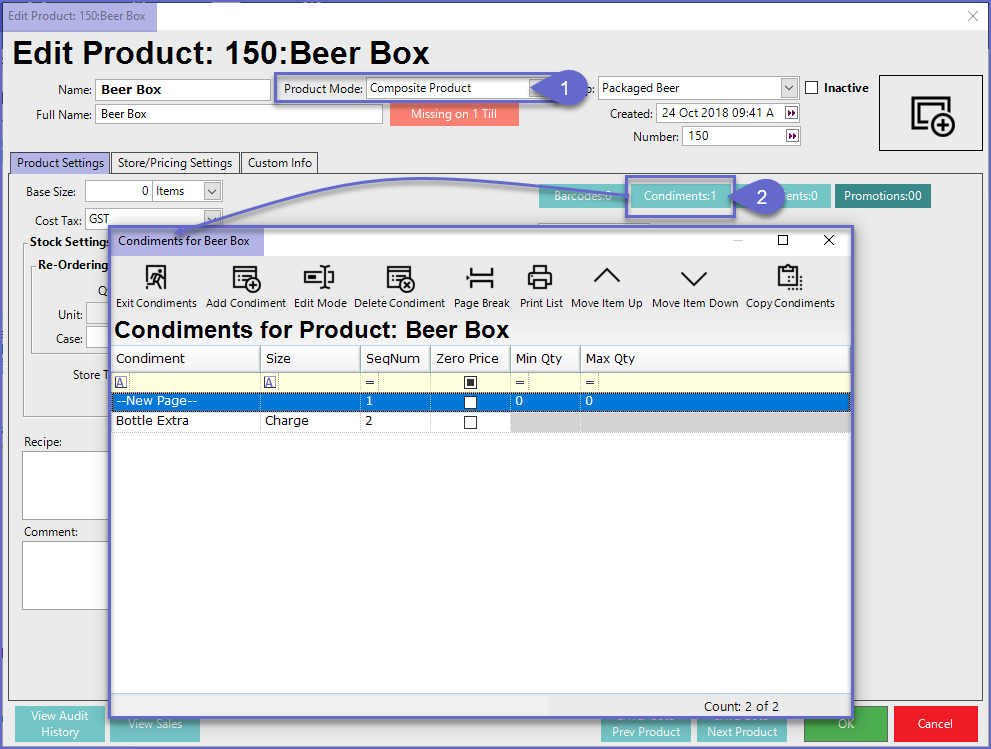 - In this example, a Normal Product named Bottle Extra (Size 1) has been applied as a condiment to the Beer Box product