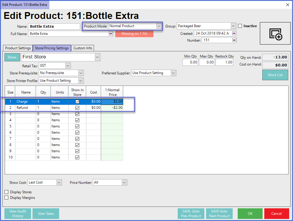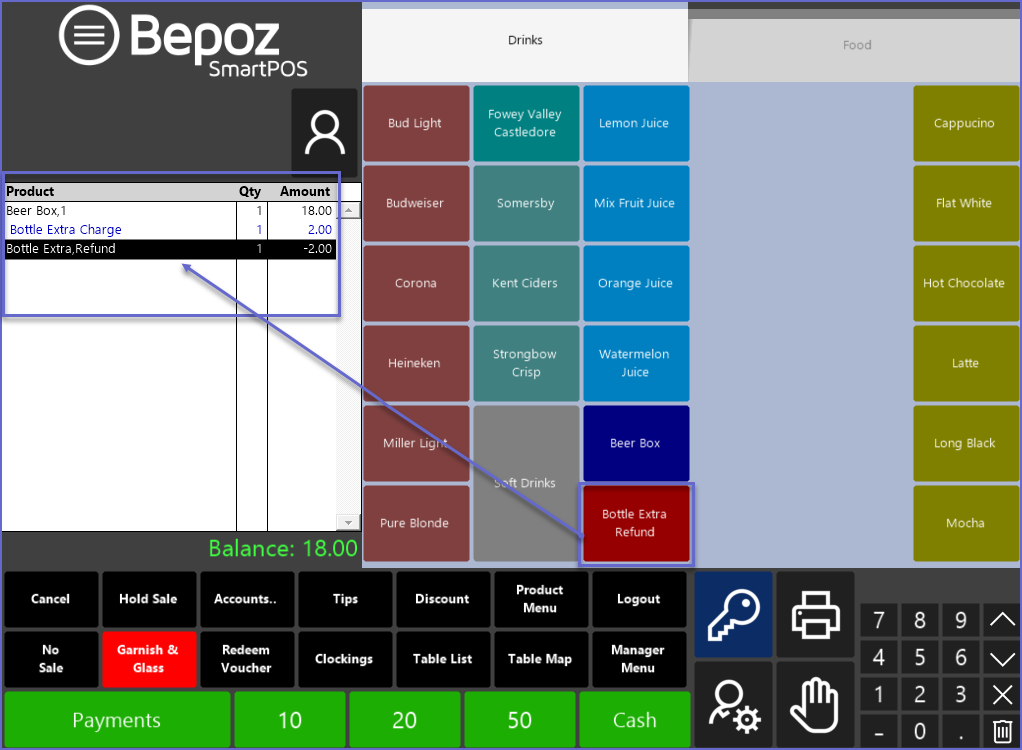 - Once the bottle has been returned by the customer, the Bottle Charge can be refunded by setting up another product button in the Product KeyMap for Bottle Extra (Size 2)