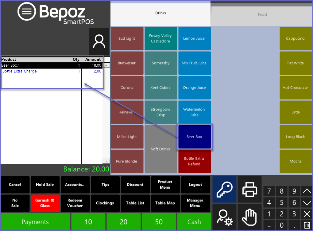 - When the Product is being sold through the Till, the Bottle Extra Charge is automatically Added to the transaction