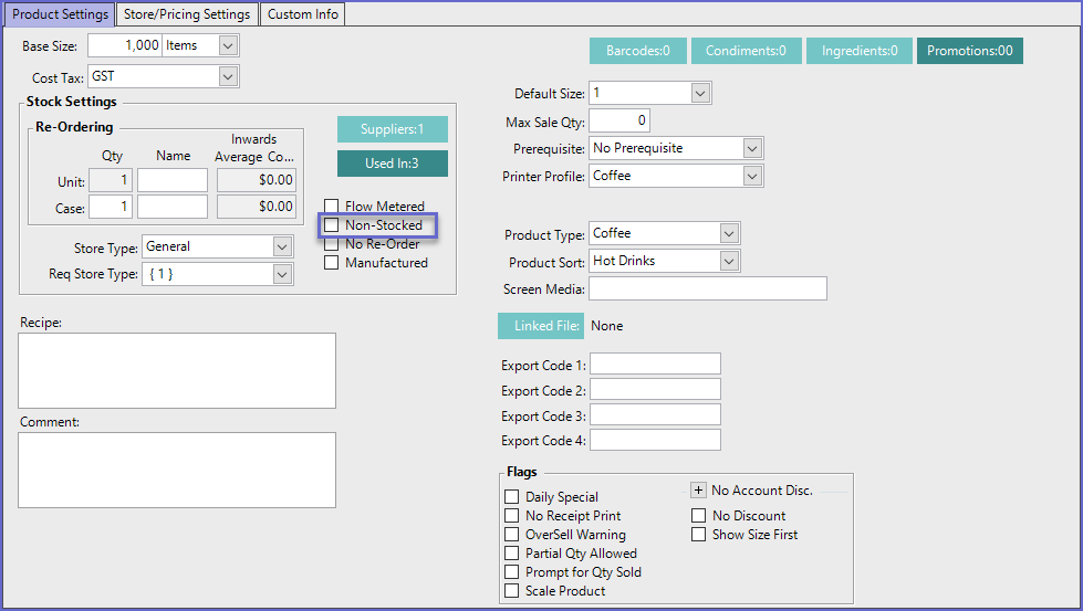 - In the Product Settings tab, the Non-Stocked flag can be turned On or Off depending on the type of product
