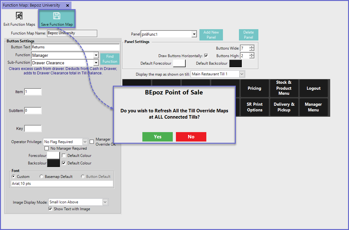 This article covers an overview of the tools and features that can be used for configuring Till Function Maps in BackOffice. Each Till Function Map consists of multiple Till Function Panels which can be configured with the necessary Till Function buttons and mapped to one another as required. BackOffice provides a variety of options when configuring the look, layout, and mapping of Till Function Maps and Panels.