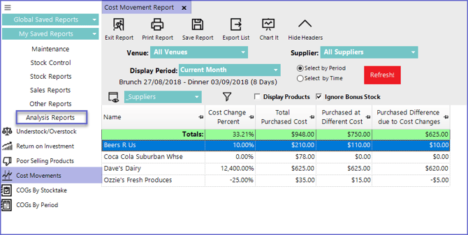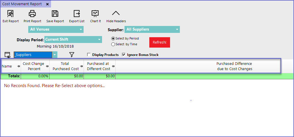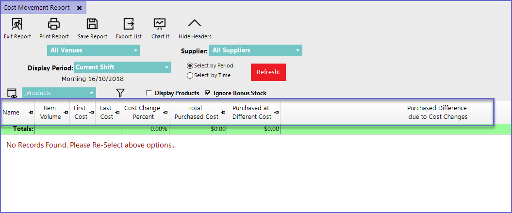 - Select Cost Movements Report which will open a new Cost Movements Window