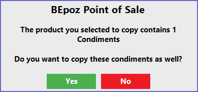 - If the Product being copied is set up with Condiment Products or Condiment Groups , a prompt will appear asking whether to copy the Condiment settings
