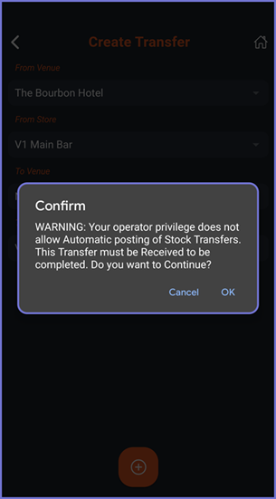 Depending on the Operator Privilege flags which are switched on, the App shall prompt the Operator a Warning message informing the Operator that the Operator Privileges do not allow automatic posting of Stock Transfers and that the transfer must be received to be completed with a Cancel and OK prompt