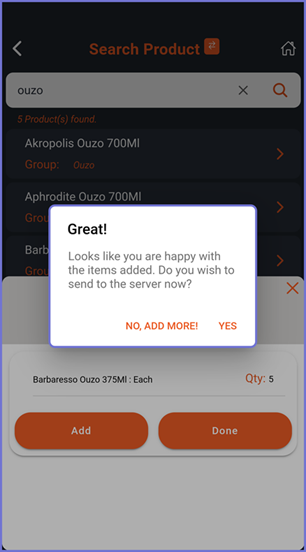 Once the Operator clicks on Done, the app prompts with a Yes and No, Add More selection