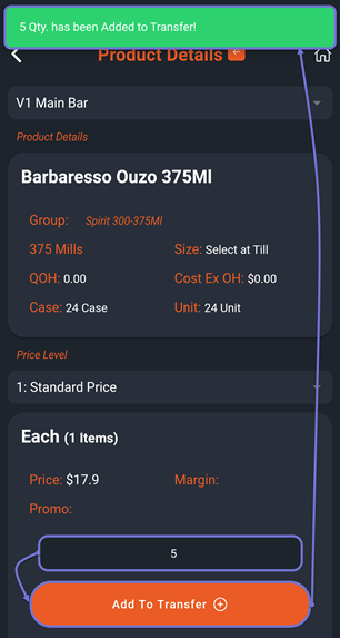 Proceed to add a quantity for the selected product in the 'Enter Qty' field within the Price Level card and click on the 'Add to Transfer' button