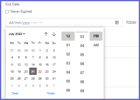 - OFF: below field for end date selection is available. Click the calendar icon in the field to choose a date/time or click TODAY next to the field to use the current date/time
