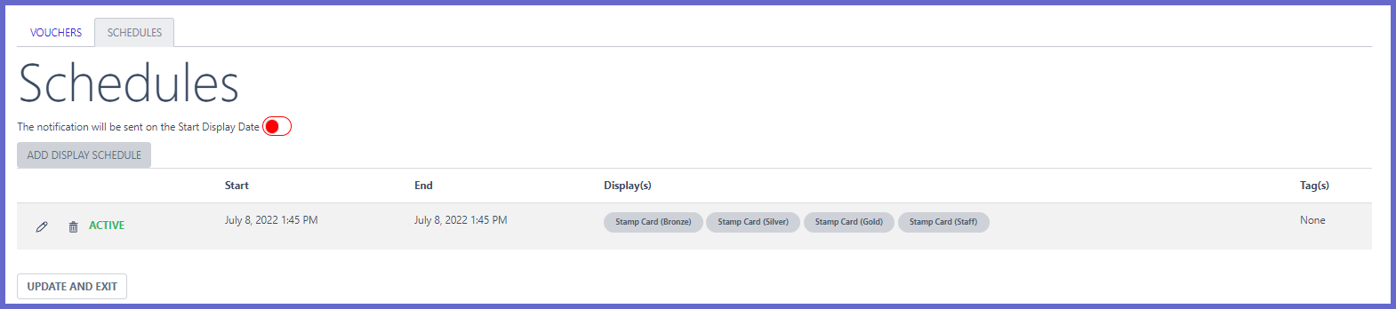 - Schedules can be attached to a stamp card to create a time period where it will display on the app and be available to use