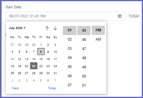 - Click the calendar icon in the field to choose a date/time or click TODAY next to the field to use the current date/time