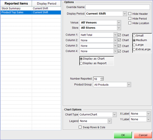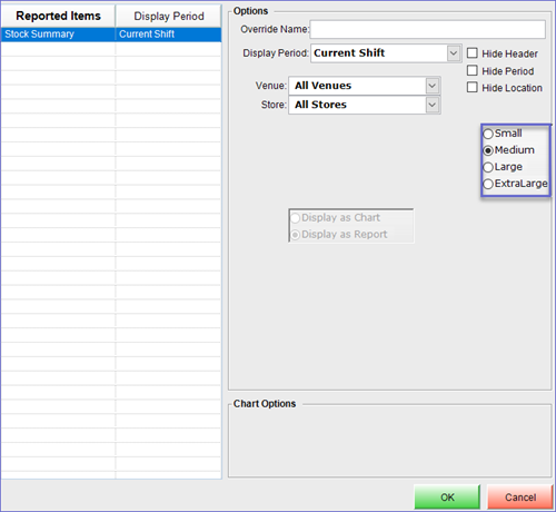 - The "Small, Medium, Large and Extra Large" Option is used to manage the Display size of the chart or graph in the Dashboard