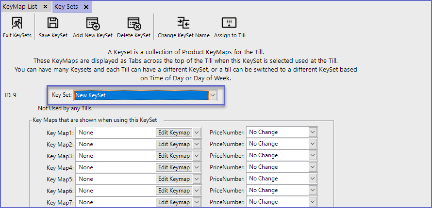 - Once the KeyMaps have been assigned to the KeySet, the KeySet can now be assigned to the workstation and the Till will display the New KeySet
