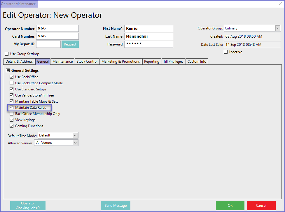Prerequisites- For an Operator to be able to access Data Rules, the 'Maintain Data Rules' flag within the General Settings of Operator Maintenance must be ticked ON