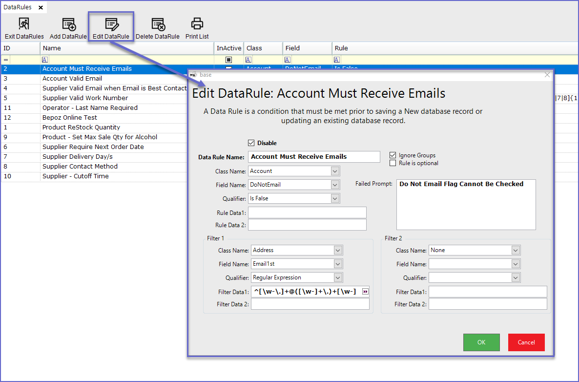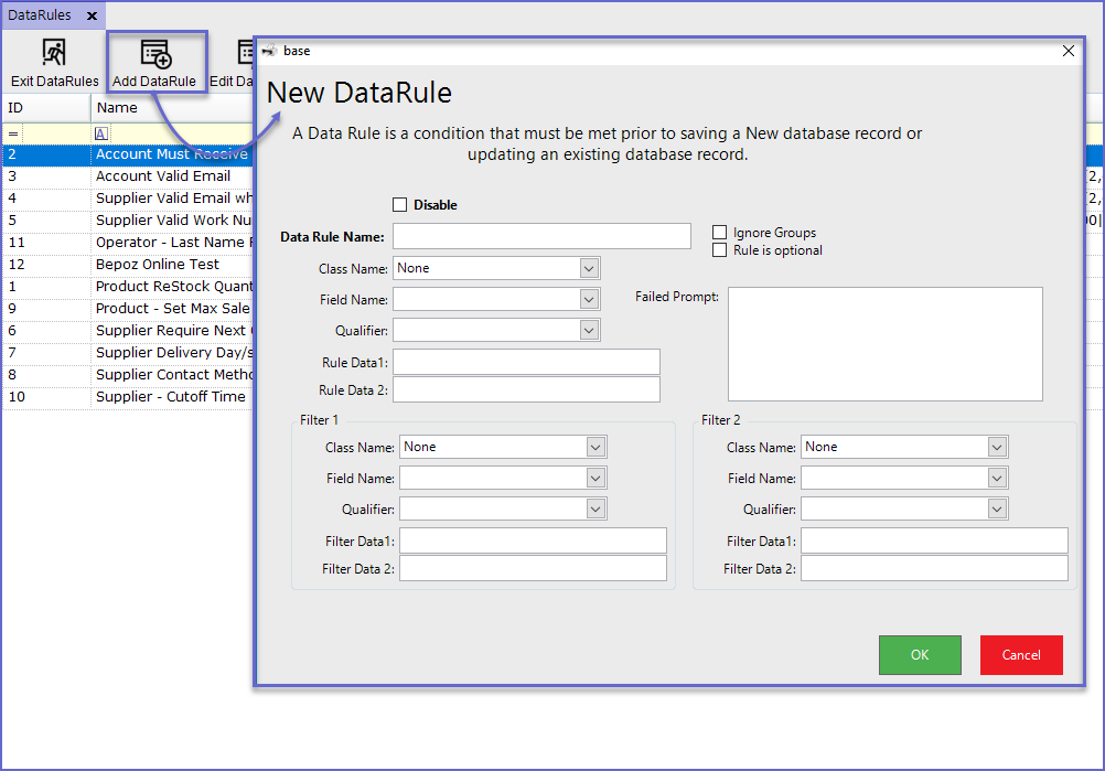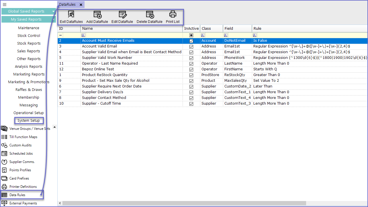 This article covers an introduction to Data Rules and they can be accessed and managed on BackOffice. A Data Rule is a condition which must be met prior to saving a New Database record or updating an existing database record. This function allows Operators to either filter unnecessary information or to ensure that the required information is entered into the system. In Bepoz, Data Rules can be Added, Edited and Deleted according to Organization's needs which are covered by this article.
