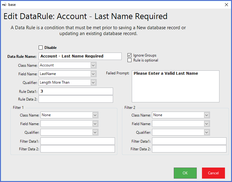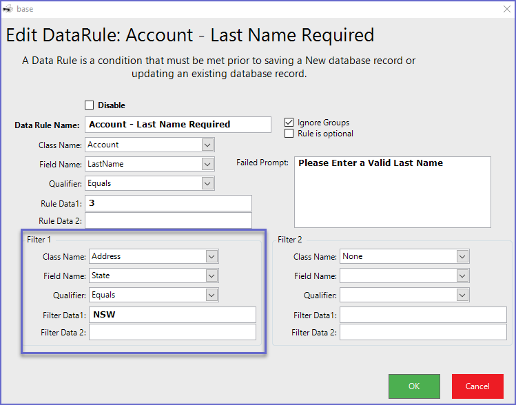 A Data Rule is a condition which must be met prior to saving a New Database record or updating an existing database record. This function allows Operators to either filter unnecessary information or to ensure that the required information is entered into the system.