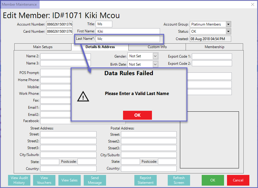 - i.e. If the Surname of the person is 'Mc', the system will not allow operators to Save the action