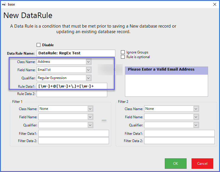 - The Filter then applies the Data Rule only when a valid email address is entered