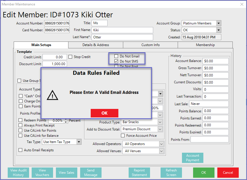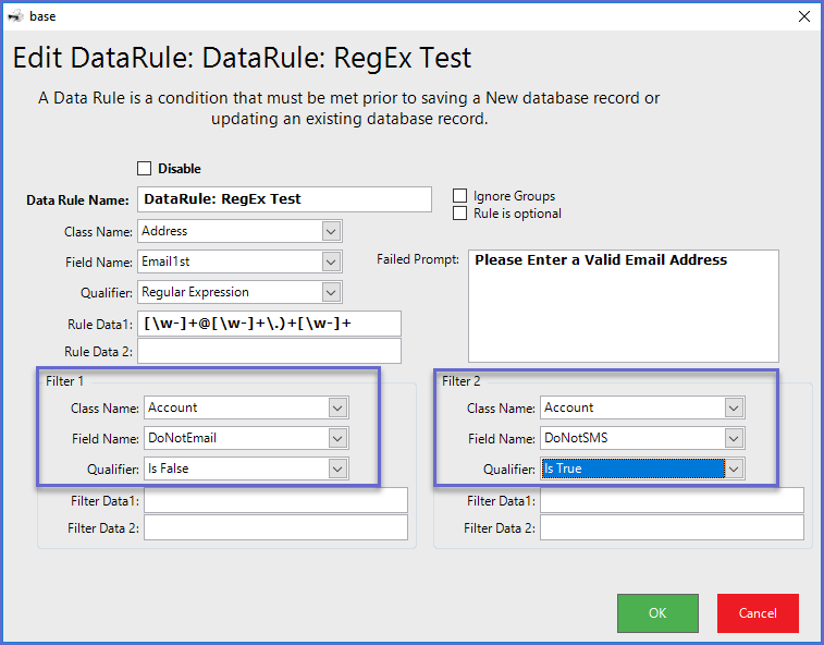 - In this example, the Data Rule requiring a valid email address will only apply when an Account's Do Not Email flag is disabled (they will accept Emails) and the Account's Do Not SMS flag is enabled (they do not want to receive any SMS)